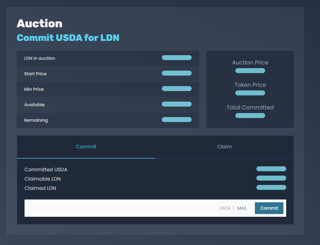 On the Commit page you can place your bid. You can use the input box to enter the amount of USDA you want to commit. The amount of LDN you would get for your USDA is then calculated based on the current auction LDN token price and subsequently recorded and reserved. Note: If there are less LDN tokens of the initially supply still available than the amount you want to reserve, your reservation will be capped to the amount that is still available.