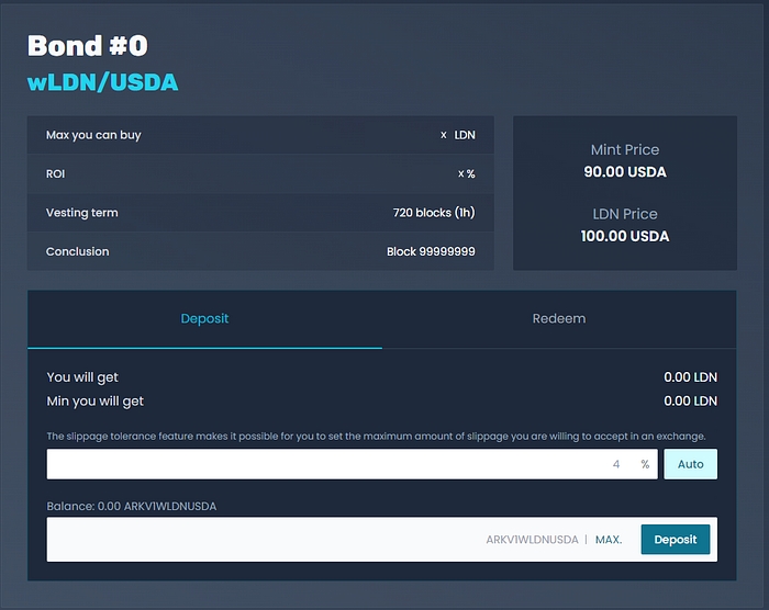 Enter the amount of tokens or LP tokens that you would like to bond in the input field and determine your slippage. Review how much sLDN tokens you will get in return. Based on the current ROI (discount or premium) on the actual LDN price.